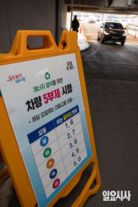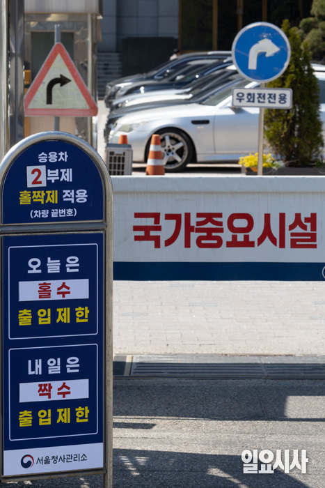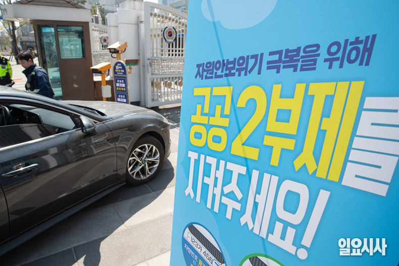 공공기관과 공영주차장에 각각 차량 2부제와 5부제가 시작된 가운데 8일 오후 서울 종로구 정부서울청사 앞에 차량 2부제를 알리는 입간판이 설치돼 있다.