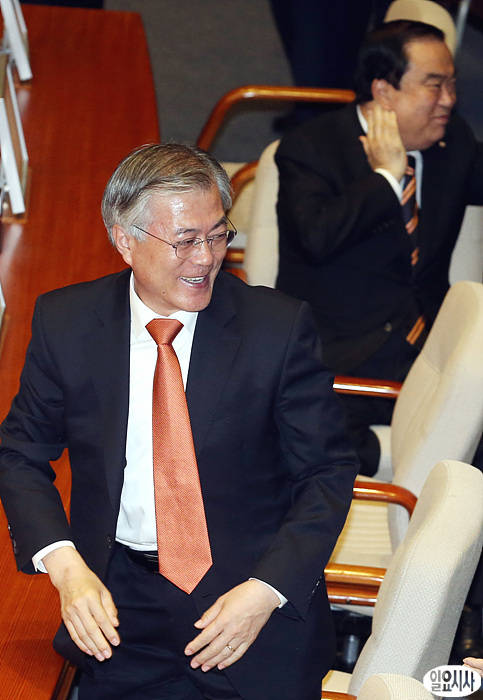 35일간 국회를 표류하던 정부조직개편안 처리가 민주통합당 등의 반발로 물건너감에 따라 새 정부가 언제 정상가동될지도 기약이 없는 상황이 이어지고 있는 가운데, 문재인 의원이 5일, 본회의에 참석해 웃고 있다.