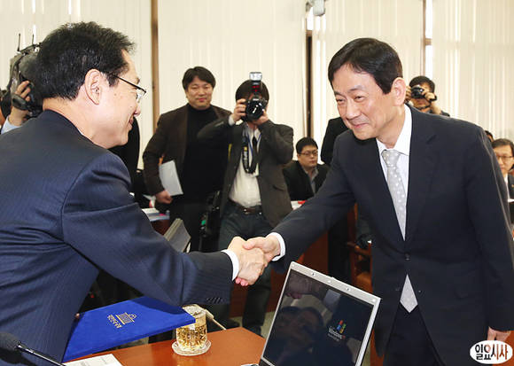 진영 보건복지부 장관 내정자가 6일, 서울 여의도 국회에서 열린 인사청문회 직전 오제세 위원장(사진 좌)과 악수를 나누고 있다.