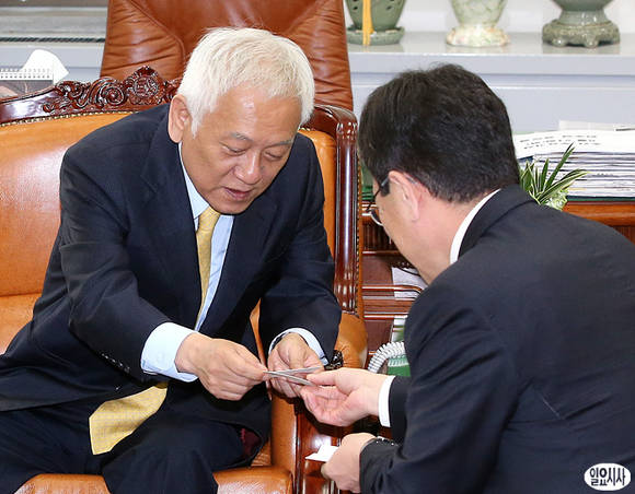 민주당 김한길 대표가 21일 국회 당대표실에서 윤상직 산업통상자원부 장관과 회동 직전 서로 명함을 교환하고 있다.