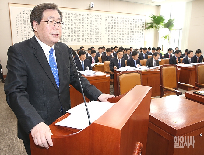황찬현 감사원장이 14일, 서울 여의도 국회 법제사법위원실에서 열린 전체회의 직전, 현안보고하고 있다.