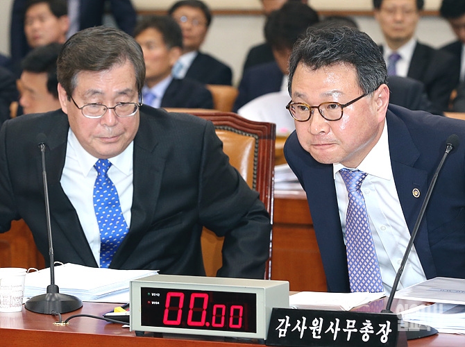 황찬현 감사원장(사진 왼쪽)과 김영호 감사원 사무총장이 14일, 서울 여의도 국회 법제사법위원실에서 열린 전체회의서 착석하고 있다.