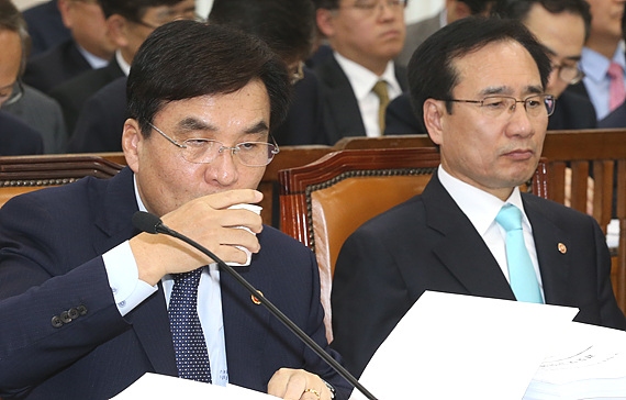 강병규 안전행정부 장관이 14일, 서울 여의도 국회에서 열린 안행부 전체회의 도중 목이 타는 듯 물을 들이키고 있다.