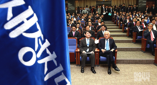 15일 오전, 김한길·안철수 새정치민주연합 공동대표(왼쪽)가 서울 여의도 국회에서 열린 의원총회에서 참석해 있다.