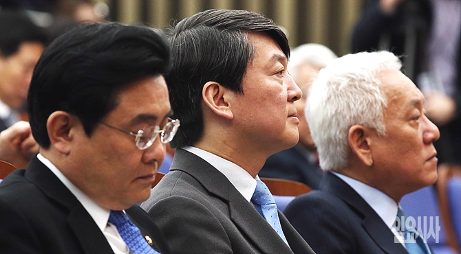 안철수(사진 가운데)·김한길 새정치민주연합 공동대표(사진 오른쪽), 전병헌 원내대표가 15일, 서울 여의도 국회에서 열린 의원총회에 참석 도중 걱정스러운 표정을 하고 있다.