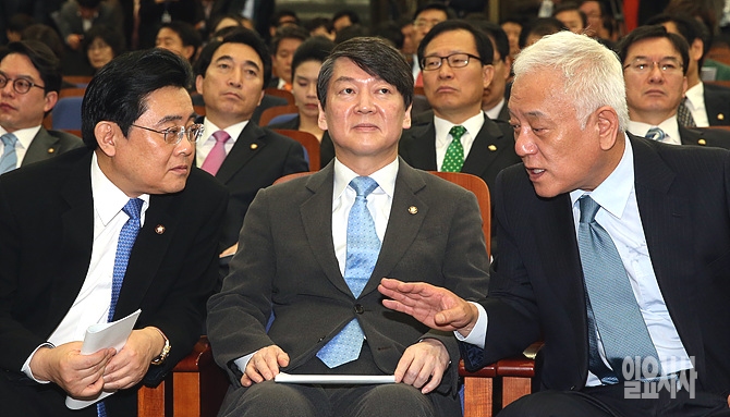안철수(사진 가운데)·김한길 새정치민주연합 공동대표(사진 오른쪽), 전병헌 원내대표가 15일, 서울 여의도 국회에서 열린 의원총회에서 이야기를 나누고 있다.