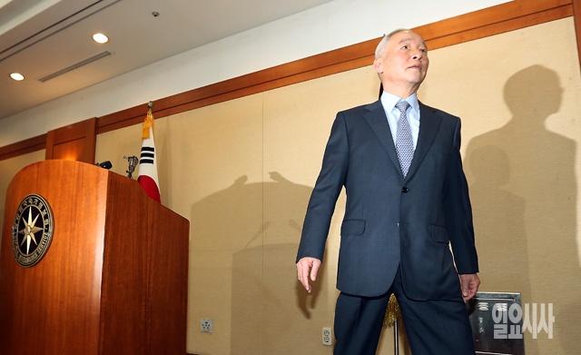 남재준 국가정보원장이 15일 국정원에서 서울시 공무원 간첩사건 서류 조작과 관련해 대국민 사과문을 발표한 뒤 퇴장하고 있다.