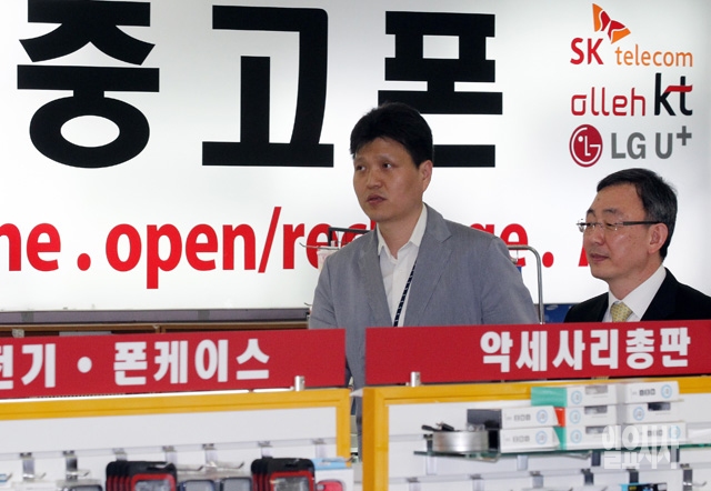 최성준 방송통신위원장(오른쪽)이 15일 서울 광진구 구의동 테크노마트 안 휴대전화 판매점을 둘러보고 있다.