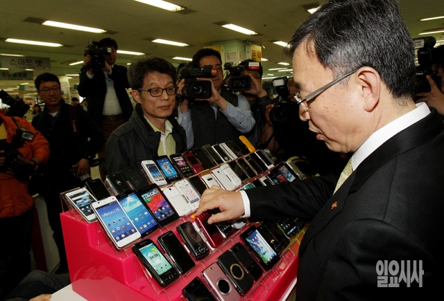 최성준 방송통신위원장이 15일 서울 광진구 구의동 테크노마트 안 휴대전화 판매점을 방문해 현장 의견을 수렴하고 있다.