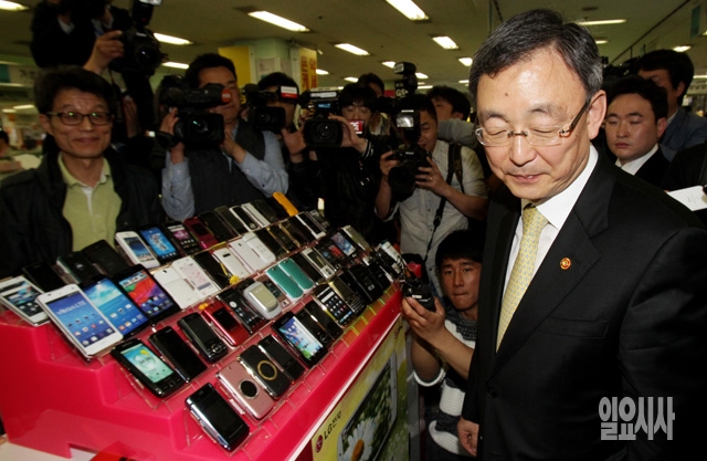 최성준 방송통신위원장이 15일 서울 광진구 구의동 테크노마트 안 휴대전화 판매점을 방문해 현장 의견을 수렴한 뒤 나서고 있다.