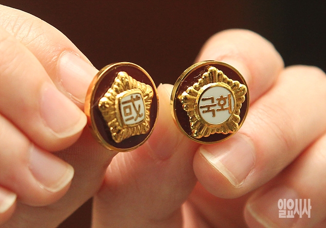 국회의원의 상징인 금배지가 기존의 한자에서 한글의 새모습으로 다시 태어났다. 16일 오후 서울 여의도 국회에서 새로 바뀌는 국회 한글 배지(사진 오른쪽)가 공개되고 있다.