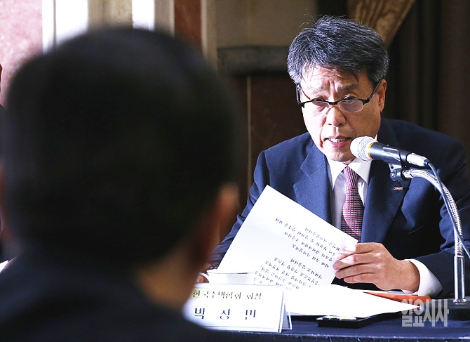 박창민 한국주택협회 회장이 16일, 서울 영등포구 여의도 렉싱턴호텔에서 열린 주택건설업계 초청 오찬간담회에서 서승환 국토부 장관에게 질의하고 있다.