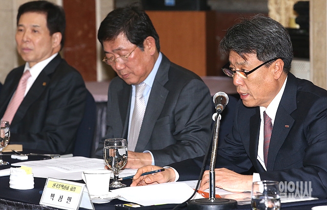 박창민 한국주택협회 회장이 16일, 서울 영등포구 여의도 렉싱턴호텔에서 열린 주택건설업계 초청 오찬간담회에서 서승환 국토부 장관에게 질의하고 있다.