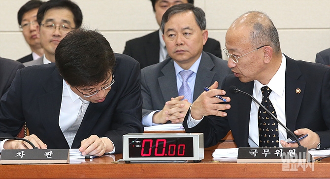 23일 오후, 문형표 보건복지부 장관이 서울 여의도 국회에서 열린 보건복지부 전체회의 도중 이영찬 차관과 이야기하고 있다.