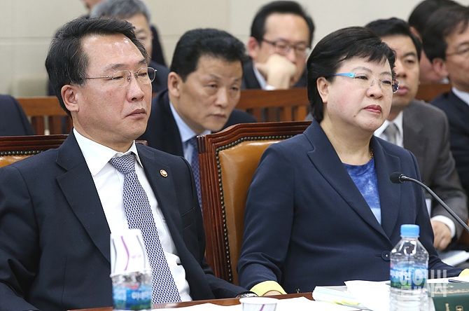 23일, 방하남 고용노동부 장관·정현옥 차관이 서울 여의도 국회에서 열린 환노위 전체회의에서 의원들의 질의를 듣고 있다.