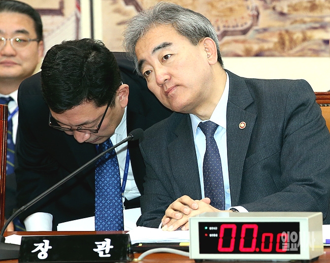 24일 오후, 유진룡 문화체육관광부 장관이 서울 여의도 국회에서 열린 교육문화체육관광위원회 전체회의 도중 관계자로부터 보고받고 있다.