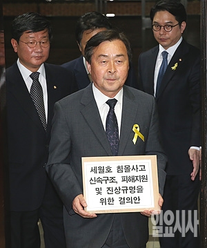 28일, 서울 여의도 국회 의안과에 새정치민주연합 김영환·전해철 의원 등이 '세월호 침몰사고 신속구조, 피해지원 및 진상규명을 위한 결의안'을 제출하고 있다.