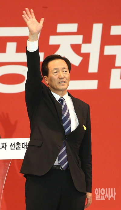 12일, 서울 송파구 방이동 올림픽체조경기장에서 열린 후보자 선출대회에서 새누리당 서울시장 후보를 확정지은 정몽준 후보가 손을 들고 기뻐하고 있다.