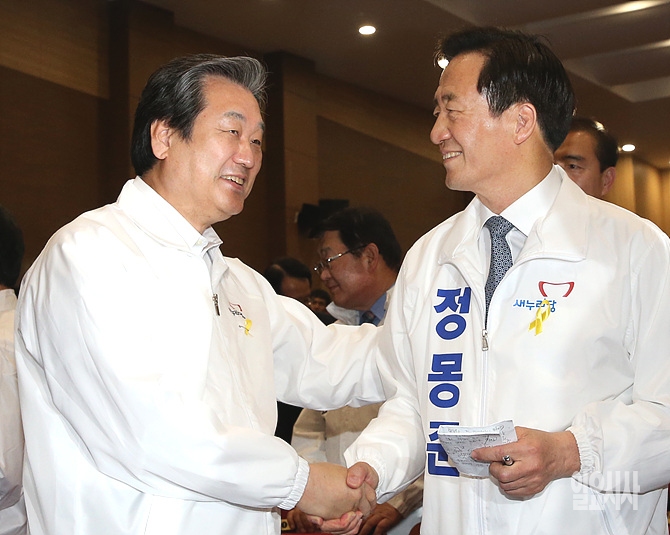13일 오후, 서울 여의도 국회 의원회관에서 열린 6·4지방선거 중앙선거대책위원회 발대식에서 정몽준 서울시장 후보가 김무성 의원과 악수를 나누고 있다.