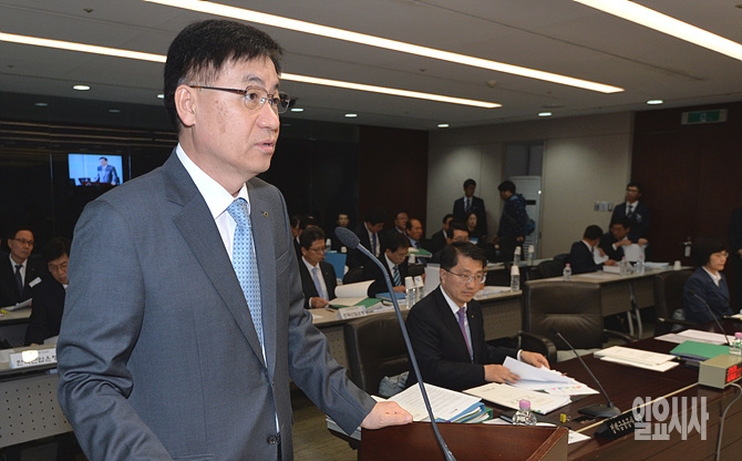 21일, 서울 여의도 국회 정무위원회 회의실에서 열린 정무위 국정감사 직전, 홍기택 KDB금융그룹 회장이 업무보고를 하고 있다.