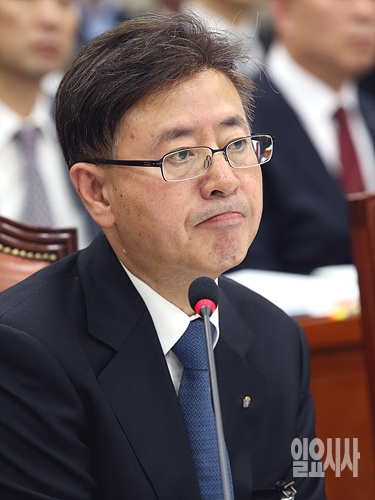 22일, 서울 여의도 국회 정무위원회 회의실에서 열린 정무위 국정감사에서 김재천 한국주택금융공사 사장직무대행이 의원들의 질문에 잠시 입을 굳게 다물고 있다.
