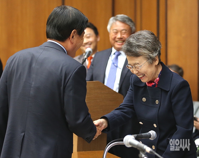22일 오후, 서울 여의도 미래창조과학방송통신위원회 회의실에서 열린 KBS 등에 대한 국정감사 직전, 서상기 새누리당 의원이 증인으로 출석한 이인호 KBS 이사장과 악수를 나누고 있다.