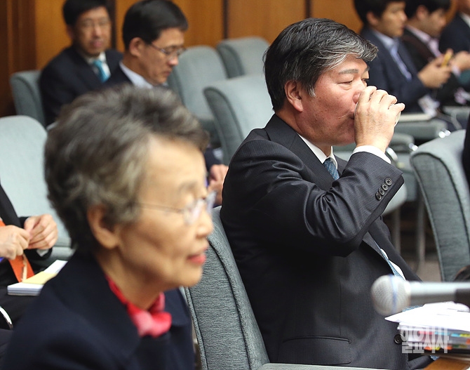 22일 오후, 서울 여의도 미래창조과학방송통신위원회 회의실에서 열린 KBS 등에 대한 국정감사 도중 조대현 KBS 사장이 증인으로 출석해 목이 타는 듯 물을 들이키고 있다.