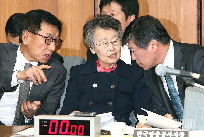 22일 오후, 서울 여의도 미래창조과학방송통신위원회 회의실에서 열린 KBS 등에 대한 국정감사에서 이인호 KBS 이사장과 조대현 사장(사진 오른쪽)이 증인으로 출석해 잠시 대화를 나누고 있다.