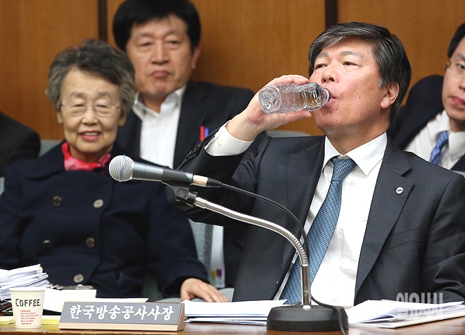 22일 오후, 서울 여의도 미래창조과학방송통신위원회 회의실에서 열린 KBS 등에 대한 국정감사에서 조대현 KBS 사장이 물통째 물을 들이키고 있다.