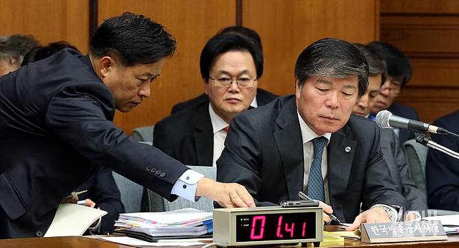 22일 오후, 서울 여의도 미래창조과학방송통신위원회 회의실에서 열린 KBS 등에 대한 국정감사에서 이날 증인으로 출석한 조대현 KBS 사장이 의원들의 질의 도중 관계자로부터 보고 받고 있다.