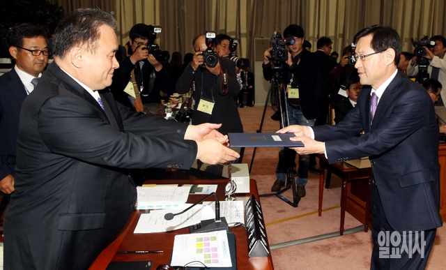 김진태 검찰총장(오른쪽)이 23일 서울 서초동 대검찰청에서 열린 국회 법제사법위원회의 국정감사에서 이상민 위원장에게 선서문을 제출하고 있다.