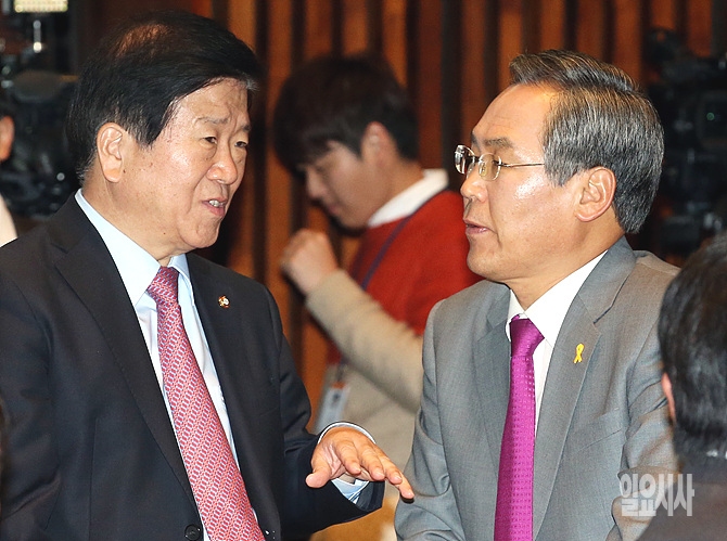 29일, 서울 여의도 국회에서 우윤근 새정치민주연합 원내대표(사진 오른쪽)와 박병석 의원이 의원총회 도중 이야기를 나누고 있다.