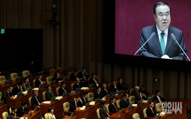 정홍원 국무총리를 비롯한 국무위원들이 30일 서울 여의도 국회에서 열린 본회의에서 문희상 새정치민주연합 비상대책위원장의 교섭단체 대표연설을 경청하고 있다.
