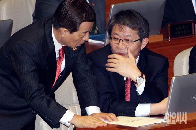 한민구 국방부 장관(왼쪽)과 류길재 통일부 장관이 30일 서울 여의도 국회에서 열린 본회의에서 이야기를 나누고 있다.