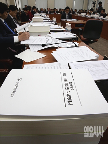 30일 오후, 서울 여의도 국회 안전행정위원회 회의실에서 내년도 예산안 처리와 관련한 전체회의가 열리고 있는 가운데 예산안 관련 책자가 책상 위에 놓여져 있다.