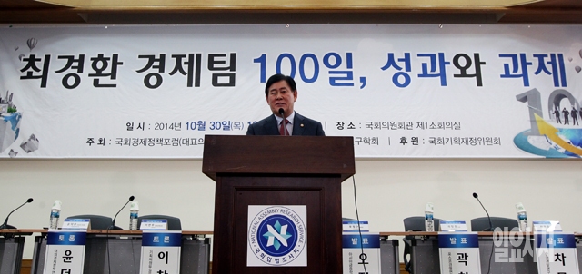 최경환 경제부총리 겸 기획재정부 장관이 30일 서울 여의도 국회 의원회관에서 열린 '최경환 경제팀 100일, 성과와 과제' 토론회에서 축사를 하고 있다.