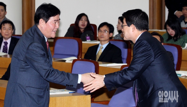 최경환 경제부총리 겸 기획재정부 장관이 30일 서울 여의도 국회 의원회관에서 열린 '최경환 경제팀 100일, 성과와 과제' 토론회에서 정희수 국회 기획재정위원장과 인사를 나누고 있다.