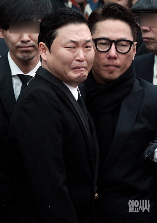 31일 서울 풍납동 서울아산병원에서 故 신해철의 발인식이 열리고 있는 가운데 가수 싸이(왼쪽)와 윤종신이 슬픔에 잠겨 있다.