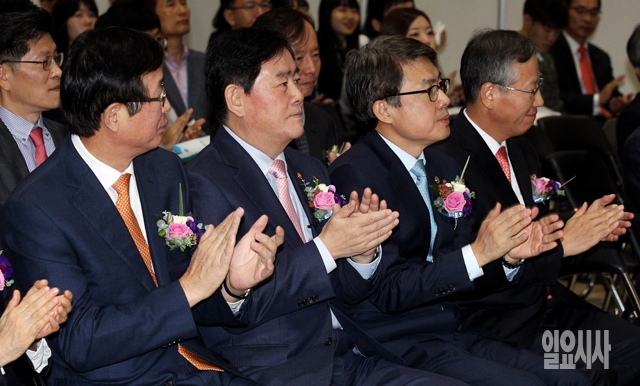 최경환 부총리겸 기획재정부 장관(왼쪽에서 두번째)이 31일 서울 삼성동 코엑스에서 열린 2014 공공기관 채용정보 박람회 개회식에서 박수치고 있다.