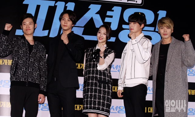 31일 서울 CGV 왕십리점에서 열린 영화 '패션왕'(감독 오기환) 언론시사회에서 출연배우들이 파이팅을 외치고 있다. 왼쪽부터 신주환, 주원, 설리, 안재현, 김성오.