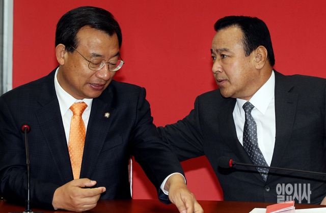새누리당 이완구 원내대표(오른쪽)와 이정현 최고위원이 3일 서울 여의도 국회에서 열린 최고위원회의에서 대화하고 있다.