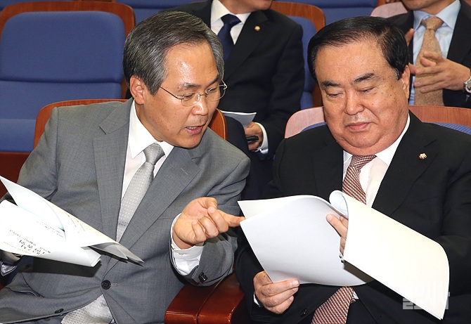 3일, 서울 여의도 국회에서 열린 새정치민주연합 의원총회에서 문희상 비대위원장과 우윤근 원내대표가 이야기를 나누고 있다.