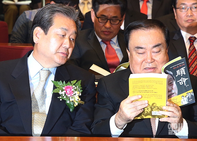 3일, 서울 여의도 국회 헌정기념관에서 열린 고 김대중 전 대통령의 가신으로 통하는 동교동계 권노갑 새정치민주연합 상임고문 출판회 도중 새누리당 김무성 대표(사진 왼쪽)와 새정치민주연합 문희상 비대위원장이 회고록 '순명'을 보고 있다.