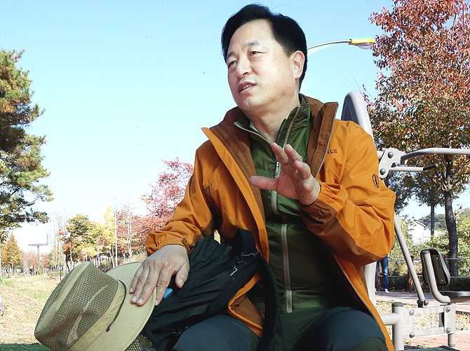 4일, 김두관 전 경남지사가 경기도 김포 지역 도보순례 직전 한 취재진과 이야기를 나누고 있다.