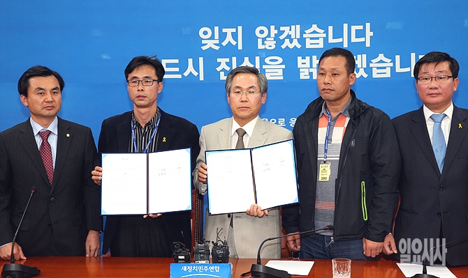4일, 새정치민주연합 우윤근 원내대표, 안규백 원내수석부대표 등 지도부가 서울 여의도 국회에서 세월호 유가족 전명선 대책위원장 등을 만나 특검 임명시 유가족 참여를 보장한다는 내용을 담은 협약서 체결 후 협약서를 들어보이고 있다.