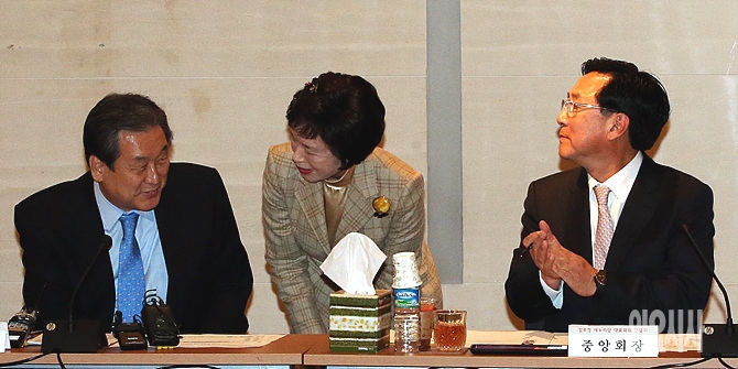 4일, 서울 여의도 중소기업중앙회에서 새누리당 김무성 대표, 주호영 정책위의장 등 지도부와 김기문 중소기업중앙회장 등 중소기업 인사들이 참석한 가운데 '새누리당과 함께하는 중소기업·소상공인 현장이야기' 간담회에서 이민재 한국여성경제인연합회 회장이 인사를 하고 있다.