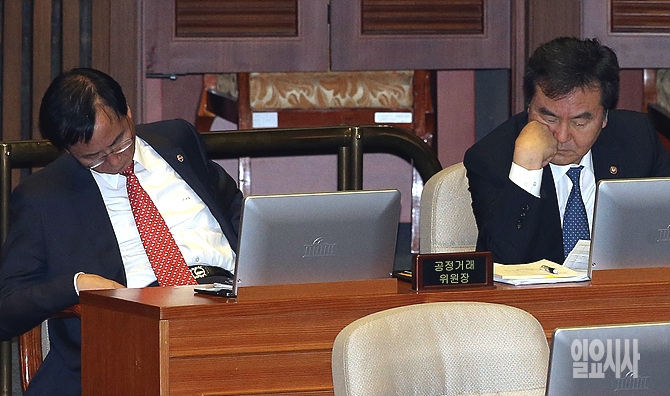 4일, 서울 여의도 국회 본회의장에서 열린 경제분야 대정부질문이 속개된 가운데, 노대래 공정거래위원장(사진 왼쪽)이 대기 중 무언가를 찾고 있다.