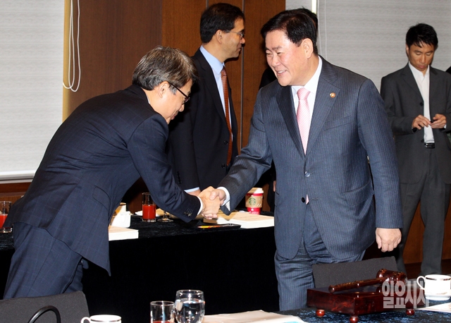 최경환 경제부총리 겸 기획재정부 장관이 5일 서울 중구 명동 은행회관에 열린 국가통계위원회에서 참석자들과 인사를 나누고 있다.