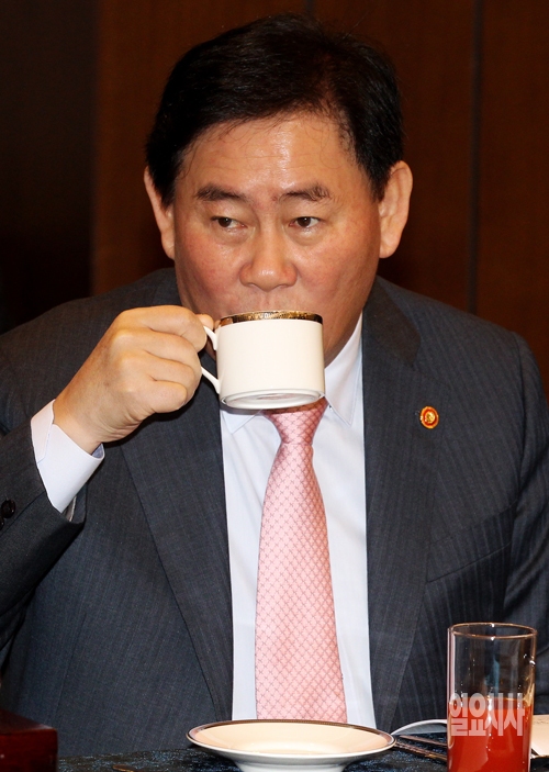 최경환 경제부총리 겸 기획재정부 장관이 5일 서울 중구 명동 은행회관에 열린 국가통계위원회에 참석해 차를 마시고 있다.