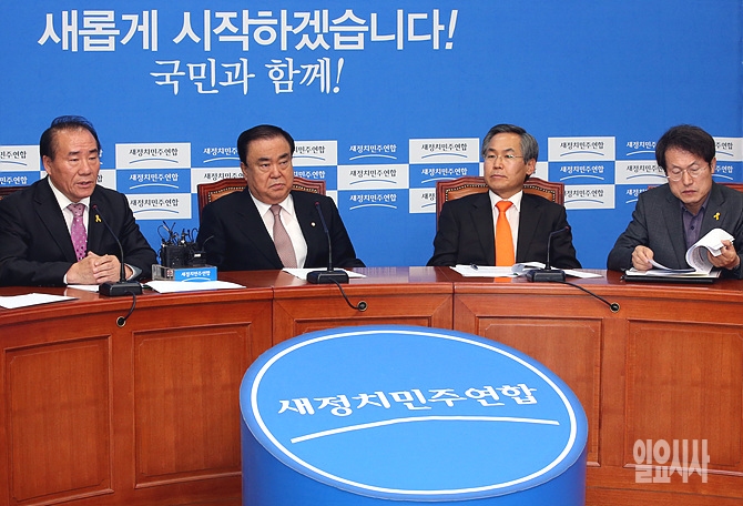 문희상 새정치민주연합 비상대책위원장(사진 왼쪽에서 두 번째), 우윤근 원내대표(사진 오른쪽서 두 번째), 조희연 서울시교육감 등이 5일, 서울 여의도 국회 새정치민주연합 당대표 회의실에서 열린 전국 시도교육감협의회 회장단 간담회에 참석해 있다.